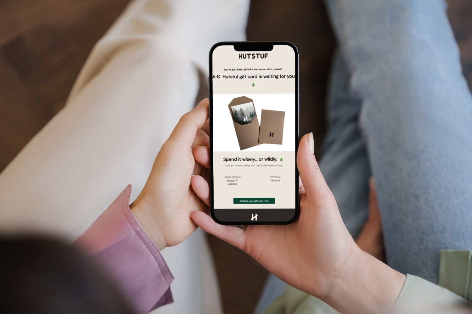 Looking for a cosy, original gift? With a Hutstuf gift card you give someone a stay in our luxury huts in La Roche-en-Ardenne or Bertogne to look forward to. You can choose between a digital gift card, sent quickly by e‑mail, or a printed gift card, beautifully designed and delivered by post. Both options are valid for a stay at Hutstuf and can be used easily when booking via our website.
