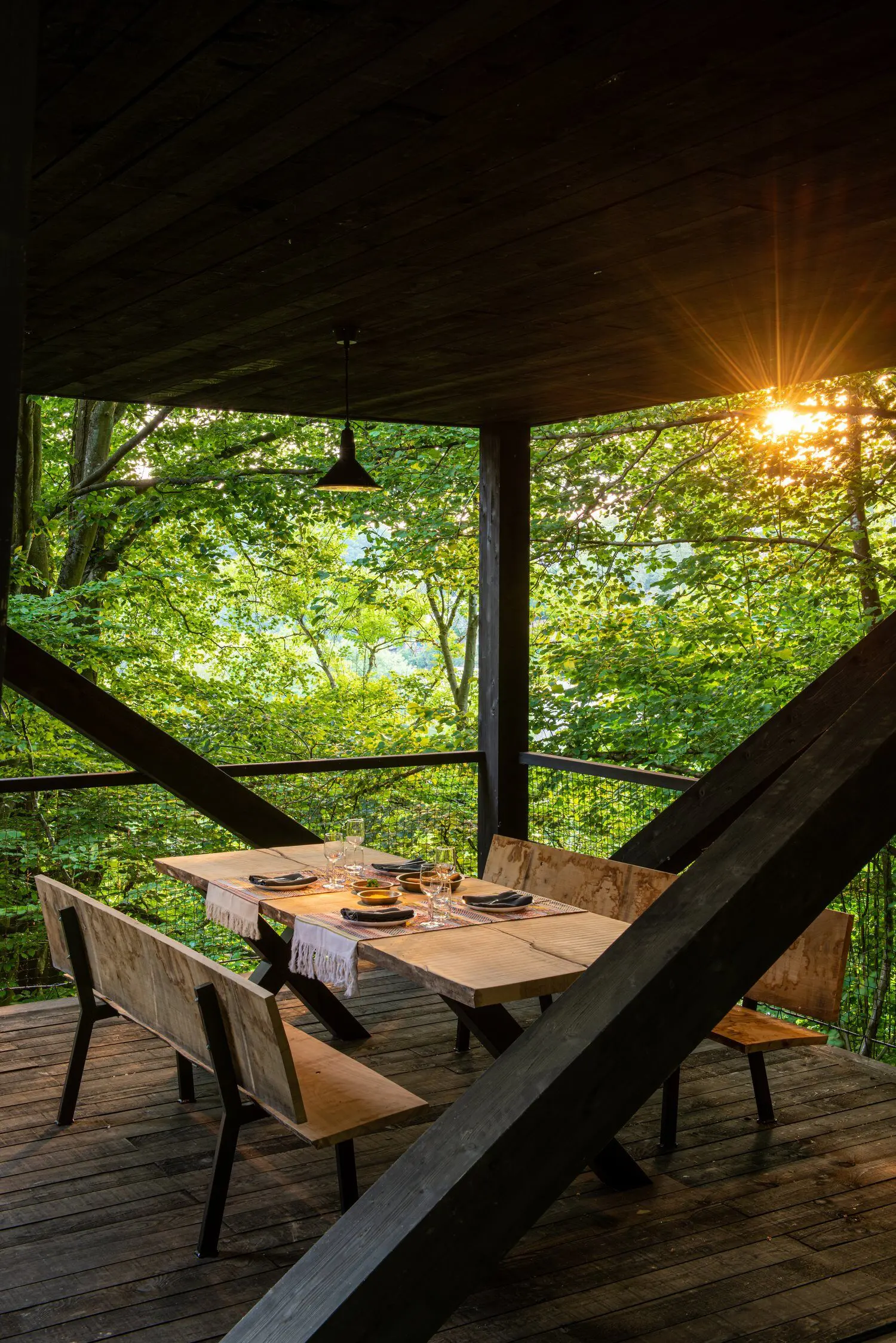 Step outside to a spacious covered terrace, where a large dining table invites you to enjoy meals, play games, or simply relax in the fresh forest air. This welcoming outdoor space is shared with The Fox cabin next door, making it perfect for families or friends travelling together who want to gather and connect.