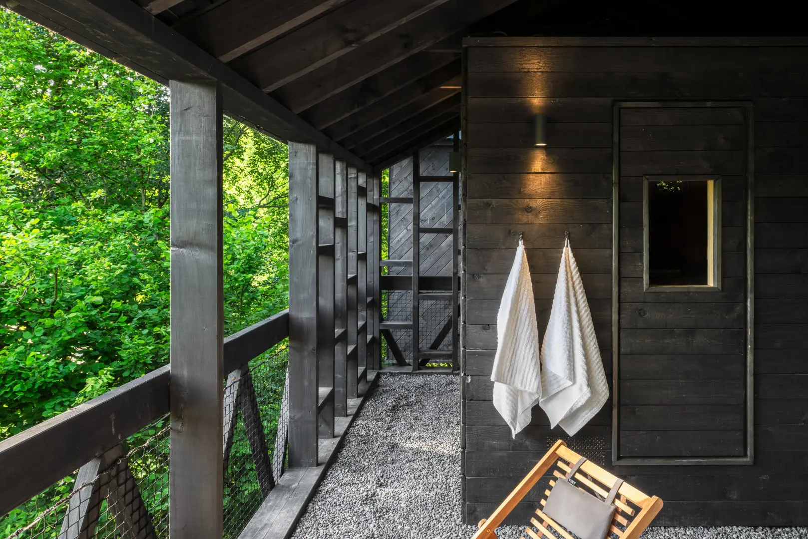 Enjoy your own outdoor lounge area, nestled under a beautifully crafted wooden canopy. This private covered terrace is where you can unwind after a day in La Roche-en-Ardenne, whether you’re relaxing in the sauna, taking an outdoor shower, or simply soaking up the peaceful forest atmosphere. Sunlight filters gently through the beams, creating a cosy yet open space that feels close to nature. With its mix of shade, shelter, and privacy, this terrace is your tranquil escape for quiet mornings, lazy afternoons, or stargazing at night. It’s the perfect spot for anyone seeking a unique stay in the Ardennes.