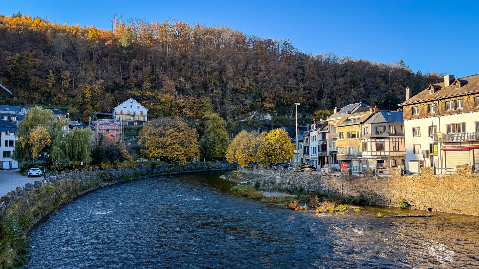 The historic centre of La Roche-en-Ardenne is compact, charming and perfect for a relaxed stroll. Traditional stone houses, small shops and cosy terraces give the village a warm and authentic Ardennes atmosphere. Walking through the streets, you’ll notice how the river Ourthe flows right along the centre, creating beautiful viewpoints and photo spots. Several bridges connect both sides of La Roche-en-Ardenne and offer peaceful views over the water and the surrounding hills. Along the riverside you’ll find benches and small green areas where you can sit down, watch the water and enjoy the calm of the Ardennes. Especially in the evening, when the lights reflect on the river, the centre of La Roche-en-Ardenne feels particularly romantic and inviting.