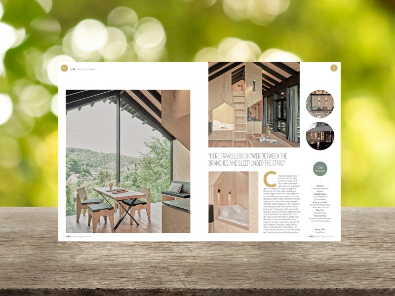 “HERE TRAVELLERS SHOWER BETWEEN THE BRANCHES AND SLEEP UNDER THE STARS” Creating a playground in the treetops, two architects have built four cabins between the trunks of a wooded spot in Belgium. Rising through the branches on stilts, each dwelling is camouflaged within the leafy expanse as the blackened exteriors revel in the shadows. When night falls however, the treehouses make themselves known with the warming glow of the interiors creating a picture of lanterns in the landscape. Stepping inside, you can’t help but swoon over the carpentry and craftsmanship of every detail. From the structures themselves, all the way through to the door handles, every nuance has been carefully considered and designed bespoke using timber from local sawmills. If and when the cabins reach the end of their life, every part can be demounted and recycled.