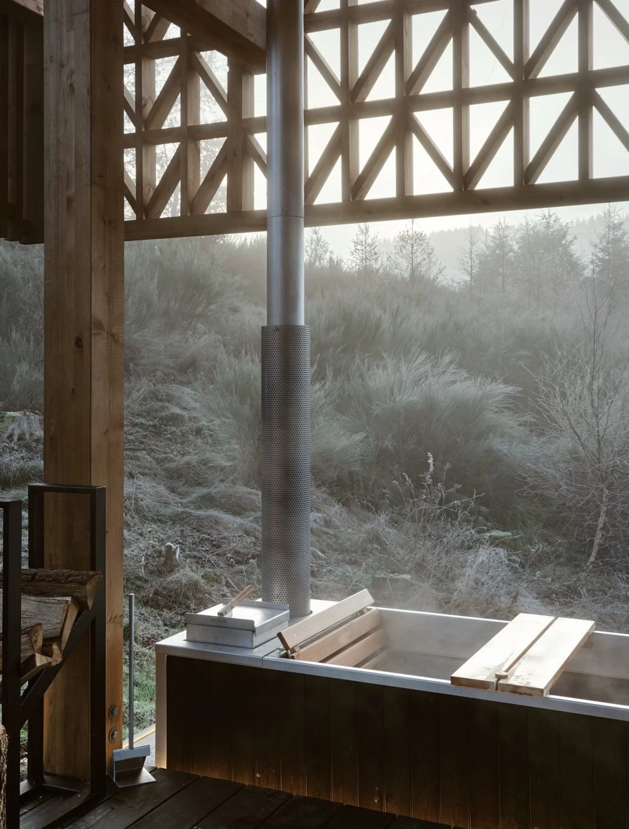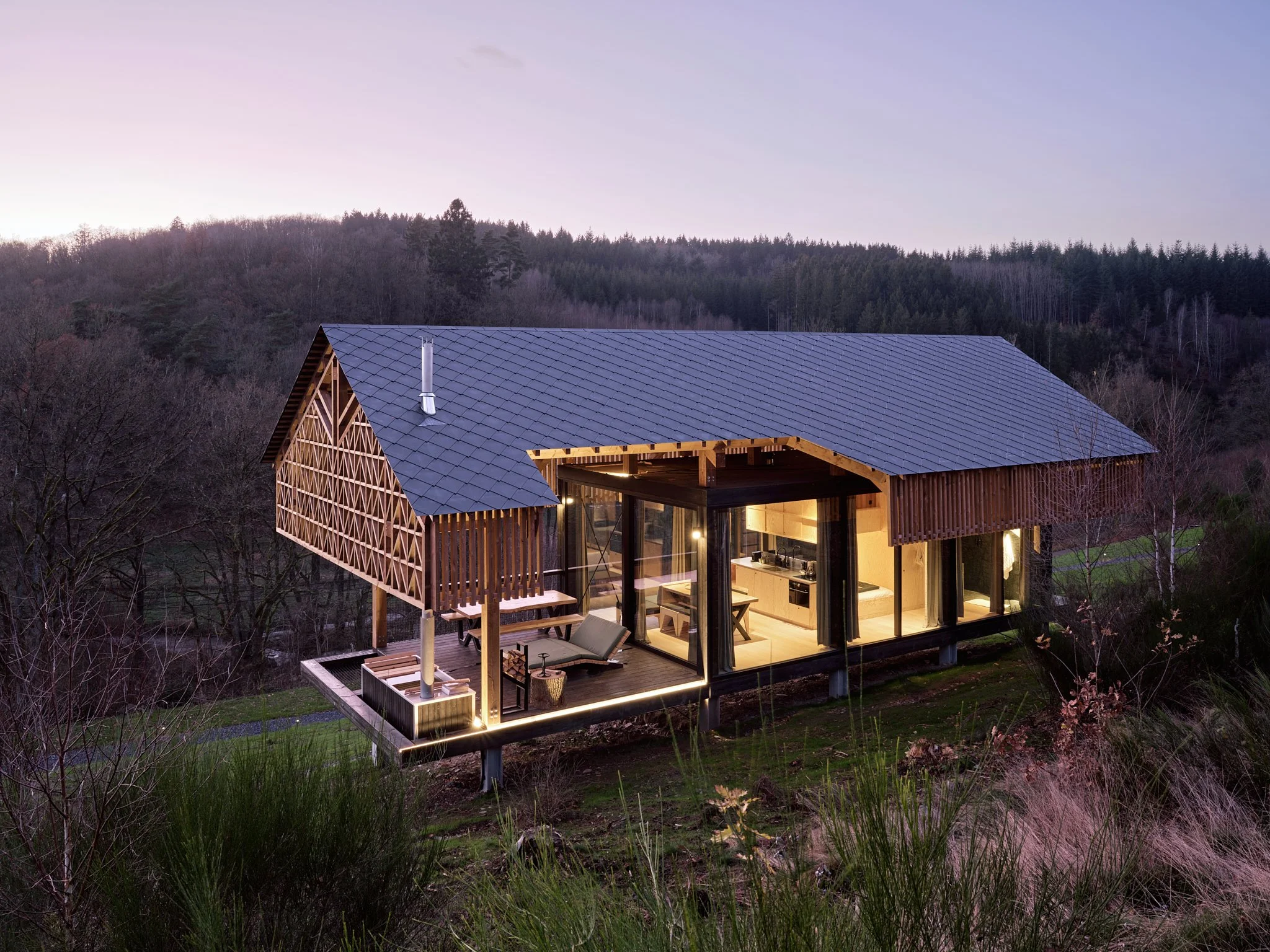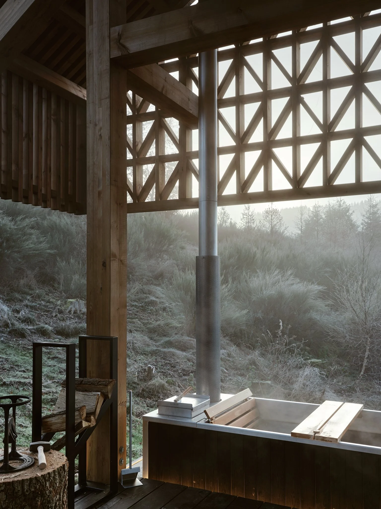 Reconnect with nature and yourself with a serene wellness experience on your private hot tub on the covered terrace. Relax in the warmth of the tub, perched on an open hillside with panoramic views of the surrounding landscape. As you close your eyes, the soothing sounds of chirping birds and the gentle breeze through the pine trees fill the air, offering a moment of pure tranquility.